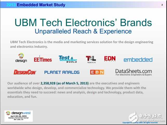在过去的2013年里,由UBM Tech Electronics做的2013年嵌入式市场报告分析了当前比较流行的嵌入式实时操作系统,为了说明这个报告的权威性,下图2.1是主办方的信息:
