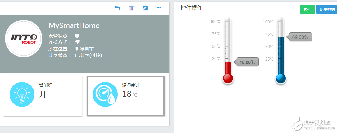 对Atom上设备的控制,其实有两种方法,一个是通过手机IntoRobot的APP来实现,如上面两个示例效果所示;