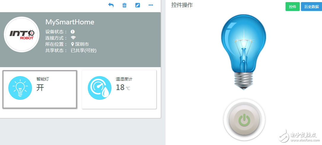2 编辑控件,之所以要编辑控制,是因为IntoRobot系统默认生成的智能灯设备,对应的控件也是智能灯的控件,如下图所示,而编辑控制的目的有两个,一个是将其设置为自己需要的控制,另一个是实现一个设备控制多个“控件”的目的。具体方法是: