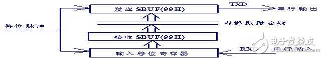 数据缓冲区分为发送缓冲区与接收缓冲区,发送缓冲区用于存放即将发送输出的数据,接收缓冲区存放串口自动接收到的外部数据,它们在硬件上是相互独立的,如图4-2所示。由于发送缓冲区只能写入而不能读出,接收缓冲区只能读出而不能写入,因而两个缓冲区可以共用一个地址,串口1缓冲区SBUF的地址为99H,注意:发送缓冲区只能写入不能读出,意思是只要把数据送进了SBUF(写入)就永远不可能再用读SBUF的方法得到这个数,虽然可以读SBUF,但读出来的是接收SBUF中的数,而不是发送SBUF中的数。