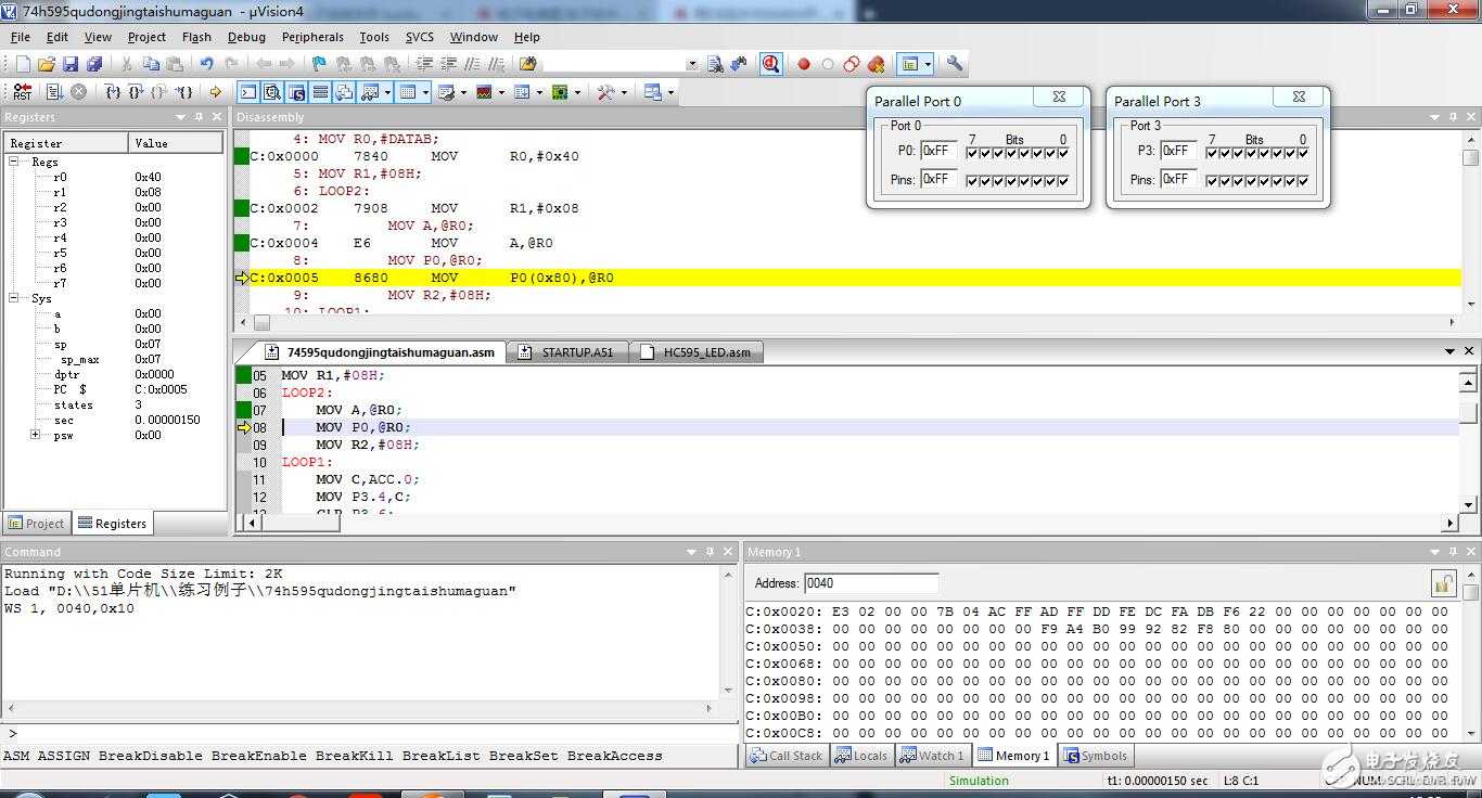 注意看累加器A中什么也没有,地址0040后已经有内容