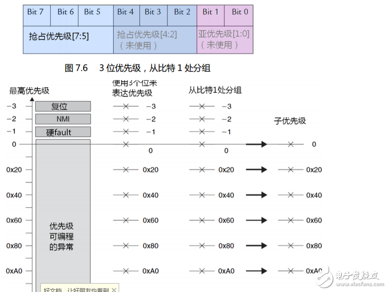 请教一个关于CM3中断优先级的问题。用8比特位显示,4位优先级,从比特4 分组,这种时候怎么计算次优先级啊?