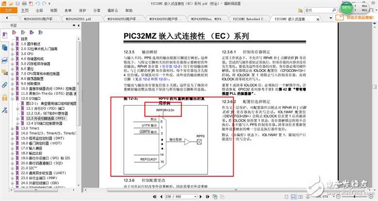 这里要提醒大家的是,凡事看到有PPS的标志的,就说明这些引脚可以重映射的。关于重映射这部分说明,大家可以参考手册的第235页的说明,注意重映射有分输入和输出的区别的,我们这里用到的PWM输出,就要看输出重映射了。这里我就贴出一些说明的截图吧: