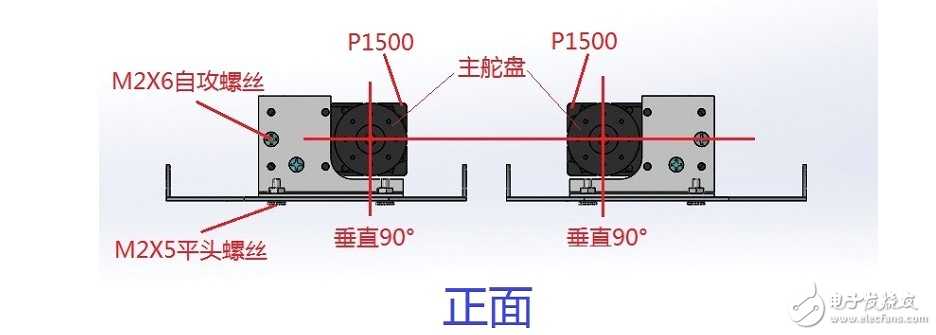 ? 如图装好之后拿出主副舵盘分别装在主轴跟虚轴上,注意在这之前通过上位机必须把舵机调到P1500位置,调整舵盘使上面的两个孔在水平位置上再用M2X6自攻螺丝与支架固定,注意先锁副舵盘再锁主舵盘。如下图: