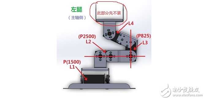 自此机器人的腿部就安装完成了,下面我们来看下两个手臂的安装。