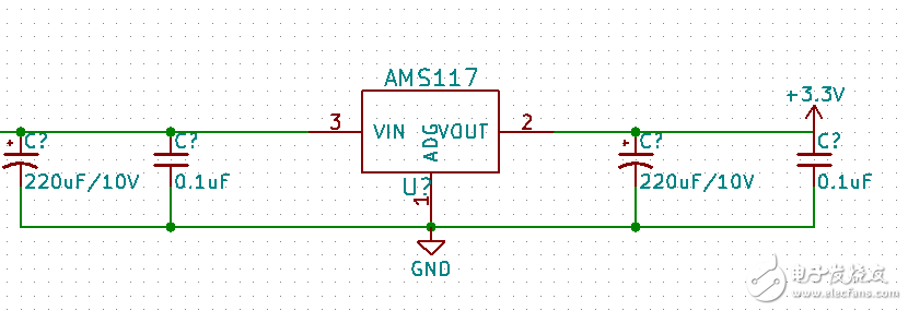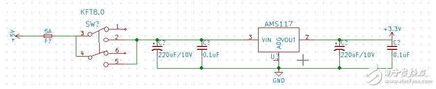 2.稳压电路设计,为了将5V电压降为3.3V电压需要使用稳压芯片AMS117,稳压芯片的电路设计为 电解电容+小电容+AMS117+电解电容+小电容 ,前面的两个电容是去除稳压芯片前面的电源噪声,后面的两个电容是为了去除后面的电源噪声。