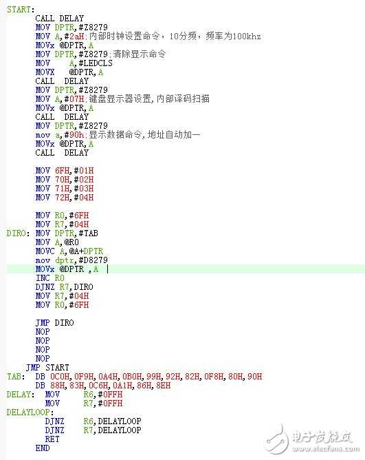 没用过这个片子,不过你的程序里jmp diro造成了死循环,不停的在向8279写四个字符,测试情况下最好只写一次,好判断状况,另外你的程序里没看到设置显示位置,比如1显示在第几个数码管,3显示在第几个数码管,一般显示程序都会包含显示内容在哪个位置显示的。