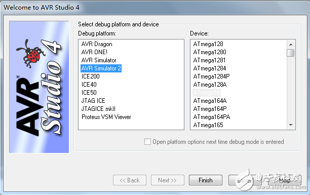 用avr studio4 加载ICCAVR 编译生成的cof文件后,选择仿真平台和控制器型号,