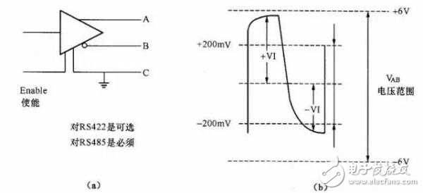 通常情况下,发送驱动器A、B之间的正电平在+2~+6V,是一个逻辑状态,负电平在-2~6V,是另一个逻辑状态。另有一个信号地C,在RS-485中还有一“使能”端,而在RS-422中这是可用可不用的。“使能”端是用于控制发送驱动器与传输线的切断与连接。当“使能”端起作用时,发送驱动器处于高阻状态,称作“第三态”,即它是有别于逻辑“1”与“0”的第三态。