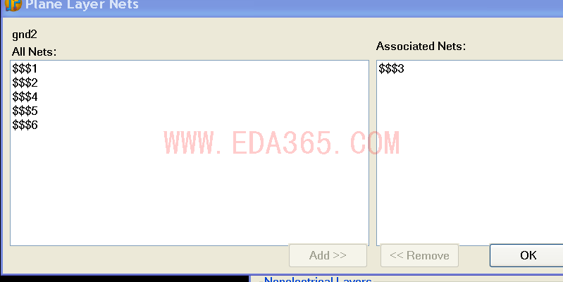 加入你到加入的网络,可以加gnd 记住只能加一个不能加多呀,也有人用2d线的方法分割负平面,但是不能自动验正,不推荐.(负片无灌水操作)如设成负平面请见http://www.eda365.com/thread-798-1-1.html