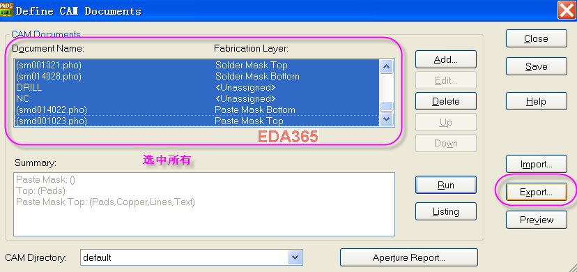 选中所有CAM输出层,Export 出一个.cam的设置文件