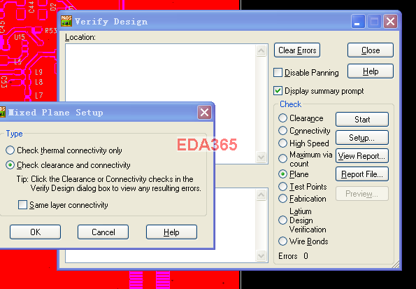 好像是因为Plane有孤立的小块铜皮通过Via与大 Plane连接起来,在进行same plane connectivity不检查的时候会报错,实际的连接性是OK。不过,可以借此检查Plane的小块铜皮是否是必须的。