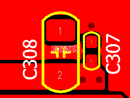 pads中异形焊盘和同网络的铜箔连不上,是何原因,异形焊盘都这个现象,不知道是什么原因,图中C307和C308和大面积铜箔是相同的网络
