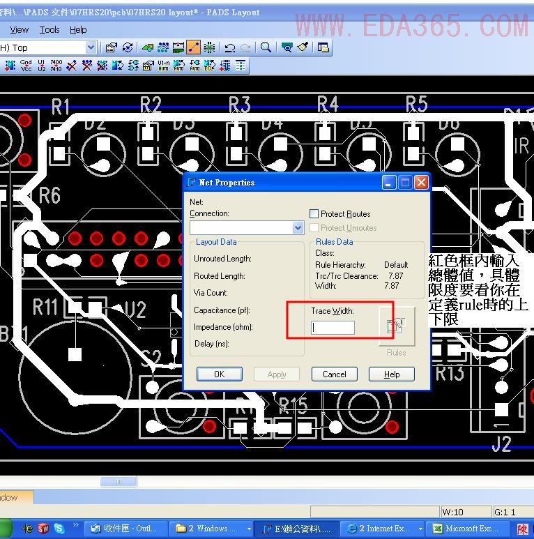 現改走線寬度的方法:右鍵select net,ctrl+a,ctrl+q,在下面窗口中設置: