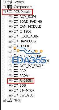 1. 在PCB decals一栏选中你想要更改的封装,比如R_0805,这样板子中所有该封装的器件都被选中了:
