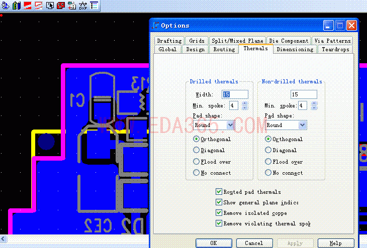 请问下,在对TOP或BOT面铺地时,与GND的焊盘成十字形连接,怎样设置呀?如图,应该是这样设置的呀,但是铺地后是与GND整个连在了一起.请帮忙?