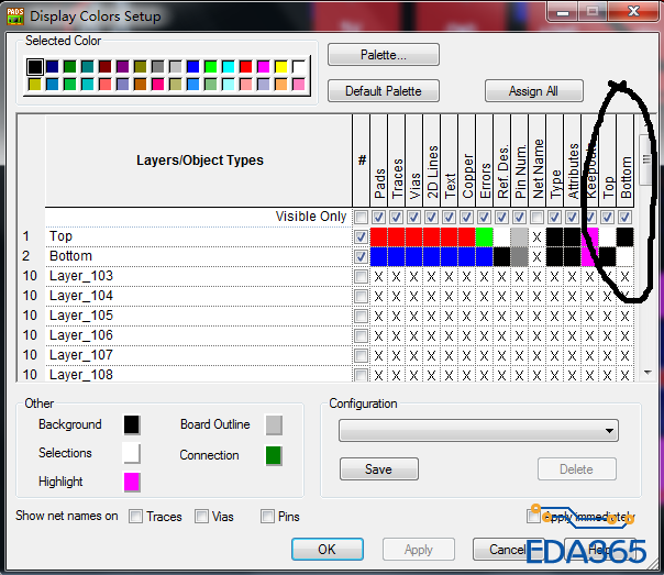 把丝印框放在all layer层时,右边的Top/bottom就有用了。有的公司喜欢这么干。如果你都是把丝印画在丝印层,这里设置为白色就行,不用管它。