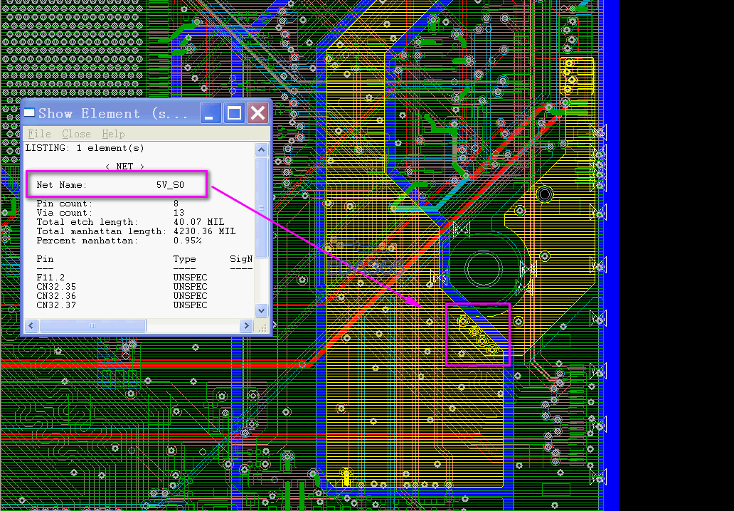 Sgnd层的蓝色pad就是via的anti pad比top层的粉红regular pad的大。(因sgnd为负片,故大的蓝色pad会被蚀刻掉。从而保证了+5v_S0 与gnd 层断开,避免short的发生)
