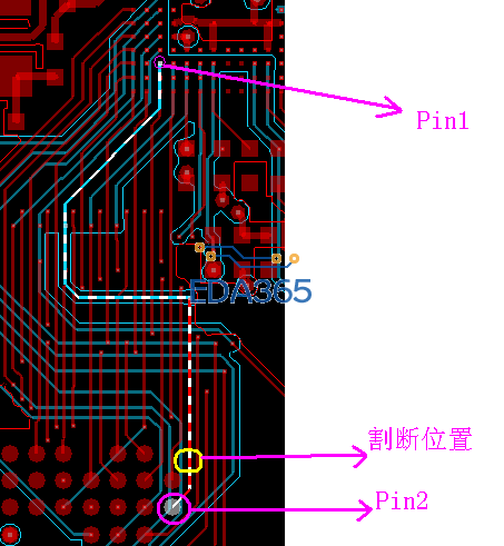 实验四:在线路顶层如图所示位置割断铜箔,此时测量PIN2输出信号正常,
