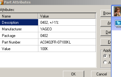 1、双击该器件(比如电阻),弹出一个如图1所示的菜单,点击VISIBLE,弹出如图2 所示菜单,勾选Attributes下的Package,确定!回到图1菜单,点击Attributes,弹出如图3所示的菜单,将封装栏填上0402就可以了。