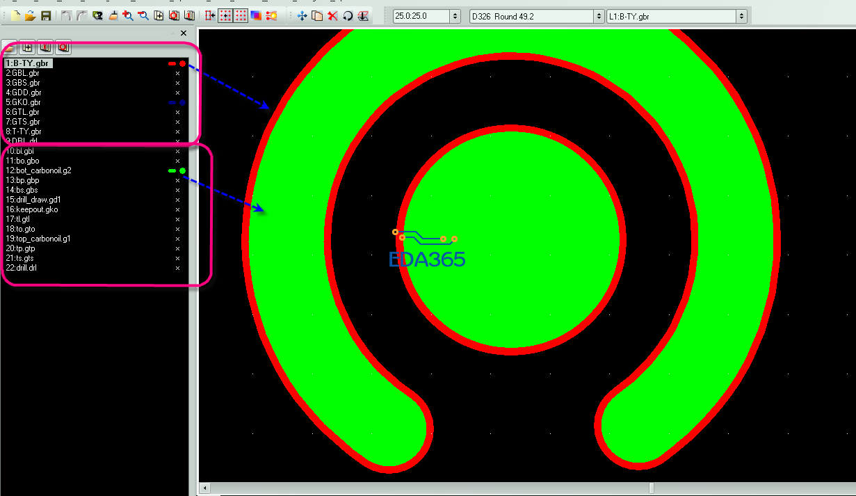 下图是截的一个比对的图(注:这个图是板厂回传的GBR和我自己的GBR的比对,而不是软件互转后的比对.截这个图的目的为了说明层面叠加后很易看出不同)