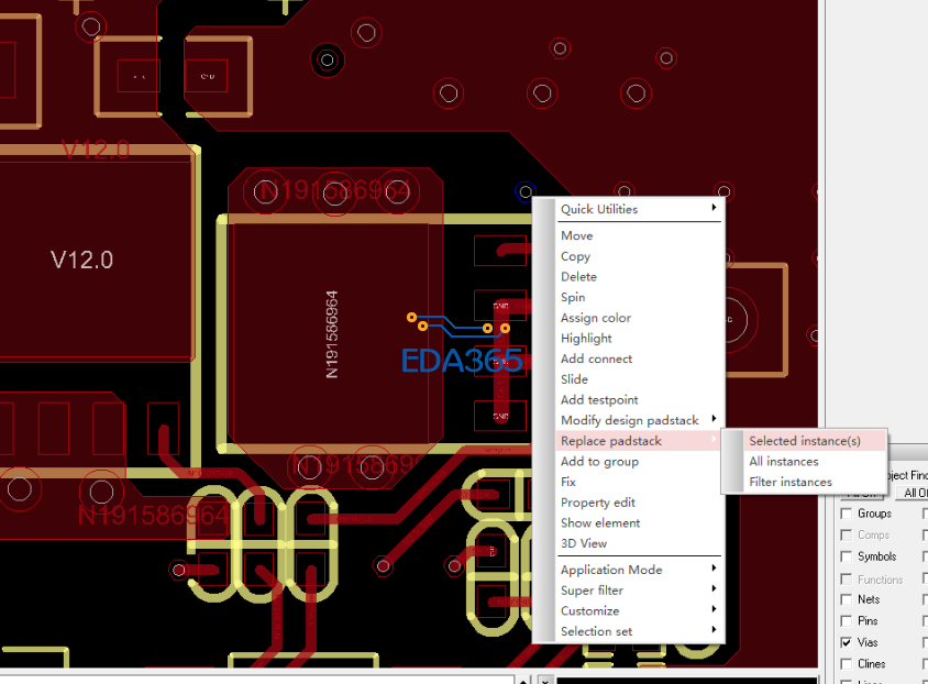 你这个方法是把板上所有同类型的过孔都替换了, 365skill可以替换某一个过孔