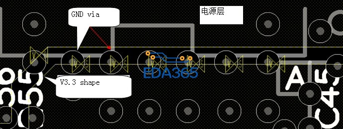 电源层3v3 的shape和GND的via 看上去已经短路了,这样在实际的做板的过程中有问题么?个人觉得没问题,因为GND via 有anti pad,所以shape在那个地方应该是被挖掉了吧?