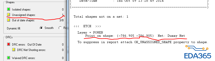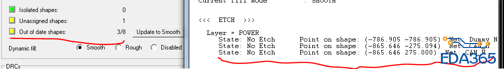 用anti etch方式铺铜,有问题,查了下是跟我当时Split Plane--creat时,铜皮网络随便取名有关系的,后来铜皮重新定义了网络,但是始终找不到这几个网络的铜,update to smooth这个选项一直提示错误,出不了Gerber。我就把这些铜删了,用shape铺铜,还是一样的问题,我都没有找到那三块铜,提示的错误比较费解。三个坐标的位置都没有多余的铜的,谁遇到过这样的问题吗?