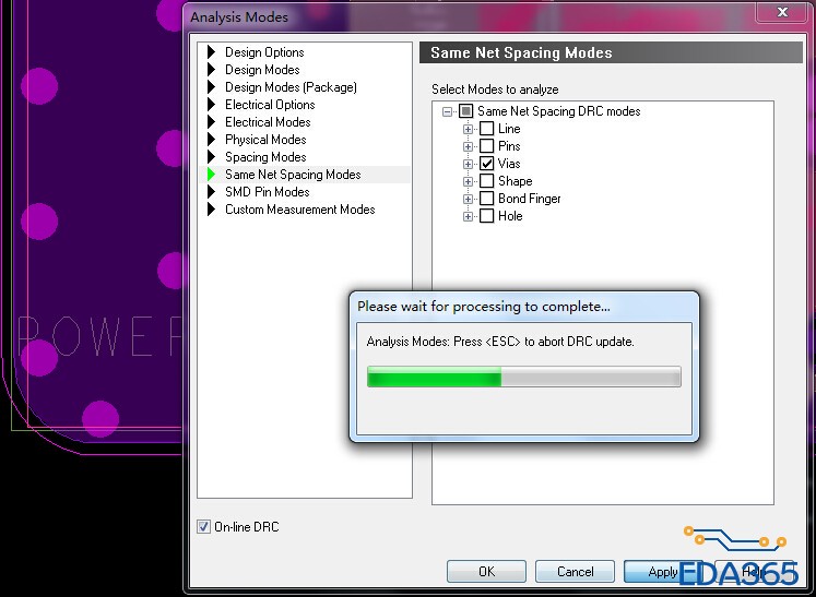 dzkcool你好,谢谢你再次给我解答,我设置了一下analysis modes-Same Net Spacing Modes里面的Vias,可是还是没有报DRC错误,是因为设置没有更新到CM么?我查了一下还是没能搞懂这里的analysis modes的设置是什么意思,用来做什么的,该如何设置它?