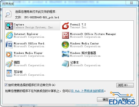 Brd的默认打开程序不能选Capture,要点击浏览按钮,然后到X:\Cadence\SPB_16.6\tools\pcb\bin目录下找到Allegro.exe去打开。