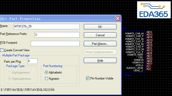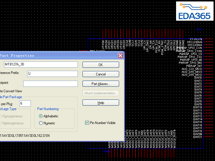 刚开始在库里画的5部分的PART MT8127,原理图画到一半时发现少了1部分,然后新建的6部分PART MT8127A,