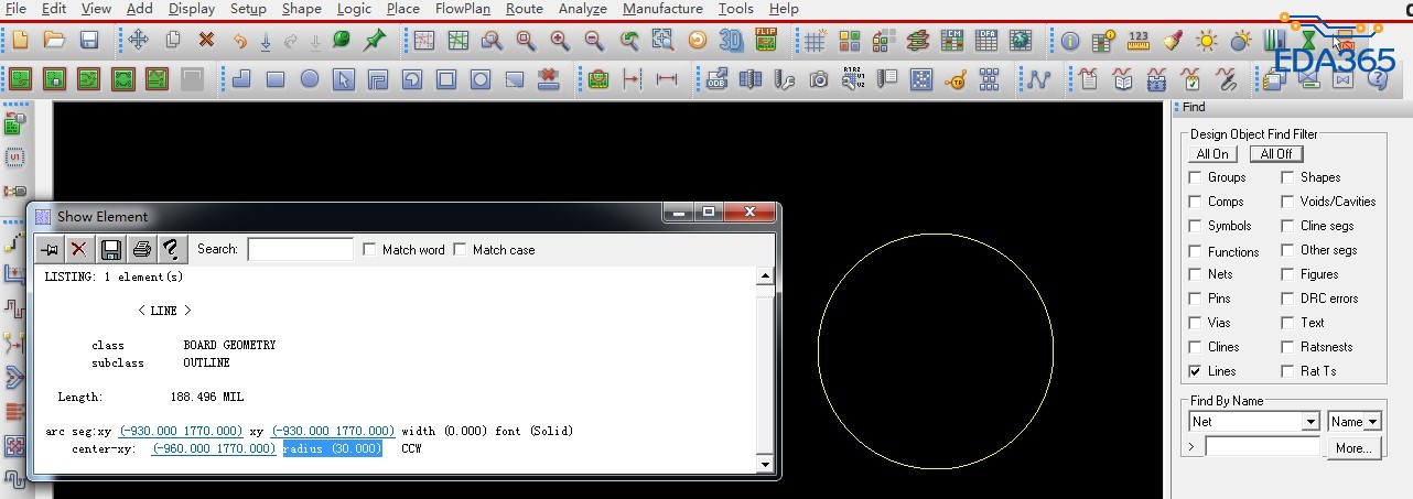 还有一种比较简单的方法就是使用show element的命令,画的是line就选line,画的是shape就选shape,有个半径的显示。