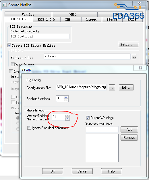这个问题我在百度知道已经回答过一次了.在orcad ---tool---create netlist--pcb editor---setup,把默认的限制字数的31改成50或者更大
