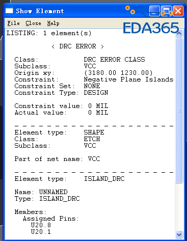 这是《cadence高速电路板设计与仿真 》上的一个例子,P271-273页,VCC被设置为negative,当对它进行动态覆铜的时候出现了D/I错误如下图一