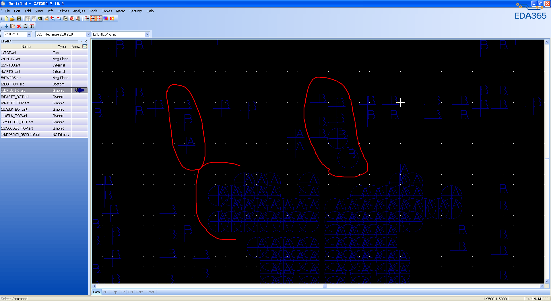 你要在cam中将钻孔文件和钻孔符号文件叠在一起看,allegro导出钻孔文件,有时候会出现孔缺失的情况,叠起来可以进行对比检查。