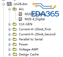 ORCAD和protel这个结构不太一样,大概解释下,在RCAD里面,你的ALL就是最顶层(就是ROOT,前面文件夹有个斜杠的那个SCH就是顶层,如果你要改可以在其他SCH上点击右键 make root即可), ORCAD这里没有明显的三层以上结构树,除了顶层,其他SCH都是被引用的对象,比如你在ALL的第一个PAGE里面引用了CLK-GEN这个SCH,那么CLK-GEN就是第二层,然后你可以在CLK-GEN里面引用crrrent-4-20mA——First,那么这个就是第三层,同样的你可以在crrrent-4-20mA——First里面引用POWER,那么power就是第四层,以此类推,就是一个层层调用的关系。