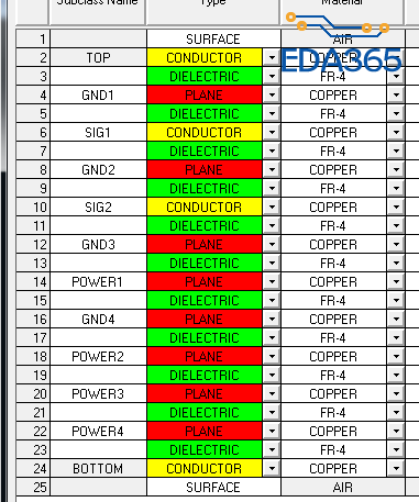 求大神们帮算下线宽线距。12层背板,要求单端阻抗50欧,差分阻抗100欧,公差都为10%。线宽8mil以内,线距5mil以内。板材为生益FR-4 S1000-2。要求板厚在3.8mm以内。叠层见下图。
