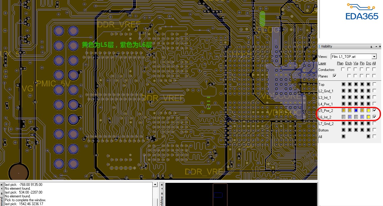 其中L2,L7都是完整的GND。L4、L5为电源(不完整)。上图中,紫色的为DDR数据线,在L6层,那么L7是完整的GND,可做其参考平面,上图可见,DDR数据线跨越了L5的电源层,这是否意味着,这个板子阻抗匹配时,L6的参考平面只有L7一层 ? (同理L3的阻抗参考平面只有L2一层?)