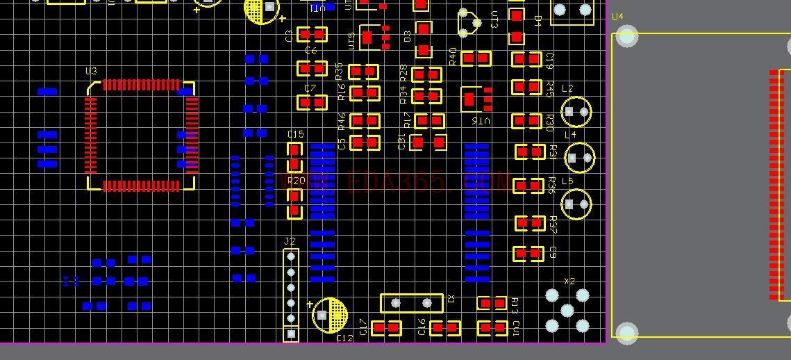 pcb板正在布局中,最后发现一个sim300的模块(图中右边红色的模块)的封装放在toplayer层,sim卡座()在buttomlayer,