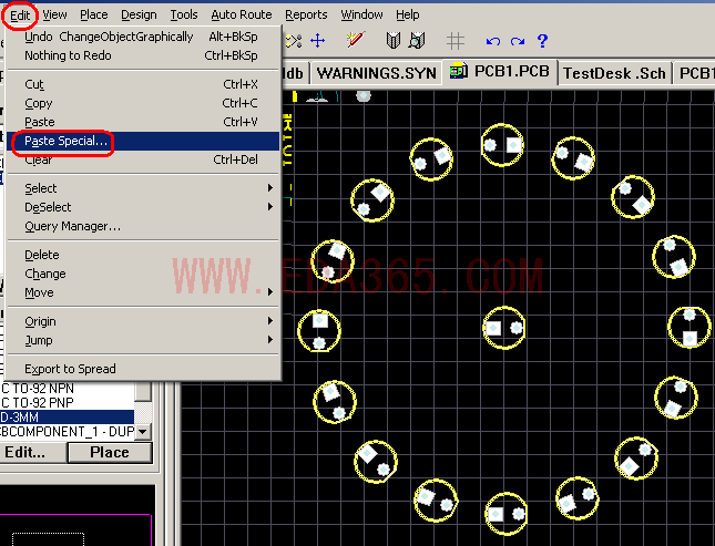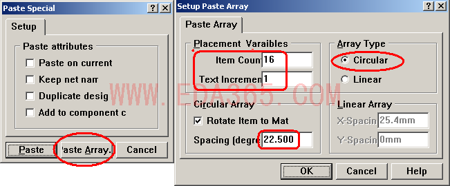 再在“编辑”菜单里选“选择性粘贴”。然后你想元件围绕啊个中心点阵列,就点一下哪里,再点一下元件中心。就阵列好了。