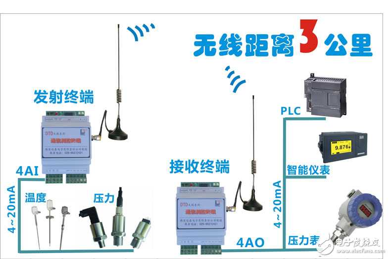 达泰1系无线测控终端,有4DI、8DI、4DO、8DO开关量信号的传输方案,也有4AI、8AI、4DO模拟量信号的传输方式,无线通讯距离可以覆盖3公里。即可以实现点对点通信,也可以实现点对多点通信,不需要编写程序,不需要布线,一般电工就可以调试使用。