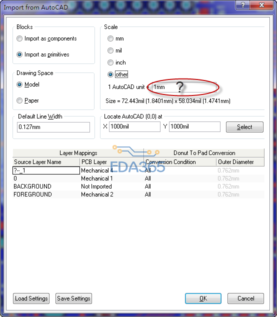 或者某些封装不是很好画,你也可以这么干,至于PCB,只要PDF能够分层也是可以的.经过这几次步骤导出的可能不是等比例关系,不过也没关系,你先1:1的导入到Altium中,之后你肯定能找出你确切的某段确切的尺寸,如DIP间距就是2.54的.你很容易算出导入的系数.
