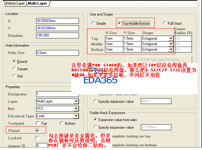 双面板做直插件时。两面都有焊盘,而且孔还是金属化了的。当然,在焊盘属性中,孔的金属化可以去掉,但顶层的焊盘如何去掉呢?