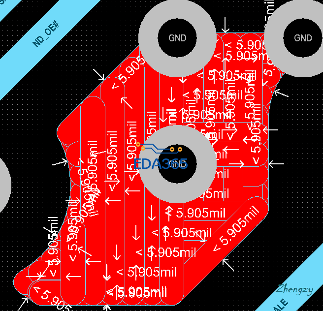 栅格距离我设置为0.1mm,图中红色为GND覆铜区域,绿色为VCC覆铜区域两个区域的距离为两个半栅格,和我设置的安全距离0.254mm符合。上方的两个红色1GND,2GND为元件引脚。中间的1VCC为接线线焊盘。