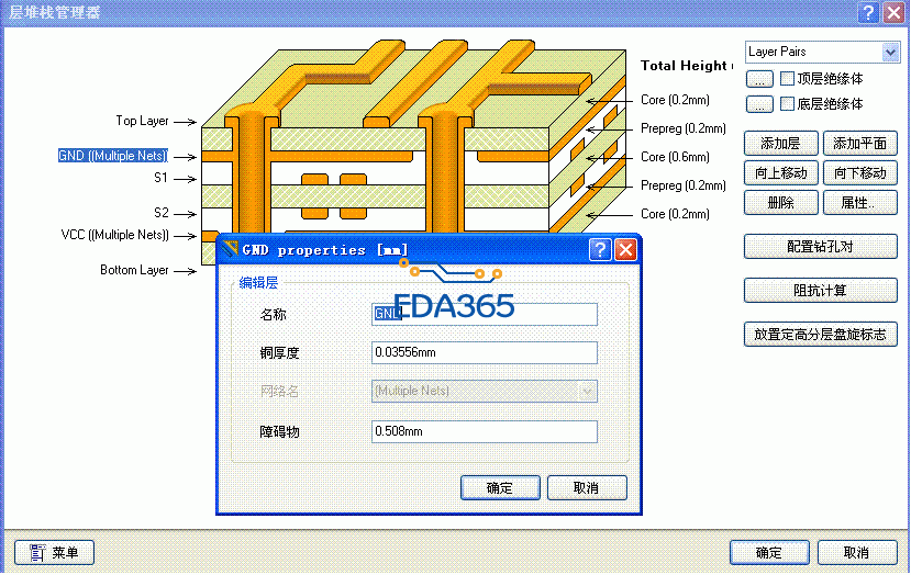 打给的按照书上1.6CM厚度的一般设置来的,不过地层和电源层铜厚多少比较合适?还有地和电源层的障碍物是什么意思?真心不懂!