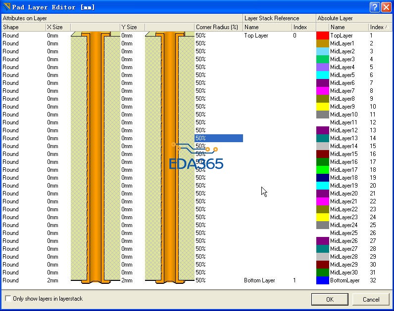 99SE 中有 Pad Stack 设置选项,AD 中亦有此设置选项(参下图效果)
