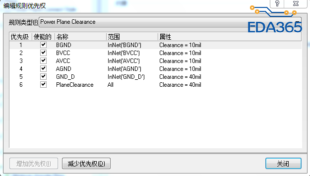问题:为什么我不管设置优先级是什么,或者间距是什么,所有的内电层间距都只会按照PlaneClearance里面设置的来实现呢?就算把PlanceClearance删掉,也不管用,只会按照默认的20mil来,我也不知道为啥是20mil,是哪里可以删除吗?不知道有没有表达清楚,总之就是我指定的内电层网络想要设置的最小间距实现不了,不知道如何实现?
