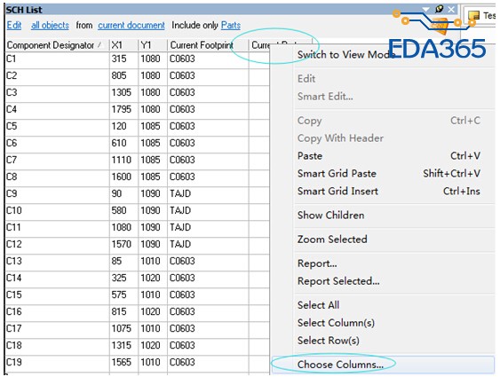 我们来设置一下,让SCH list只显示我们需要的元器件详情,并且适当排序下: