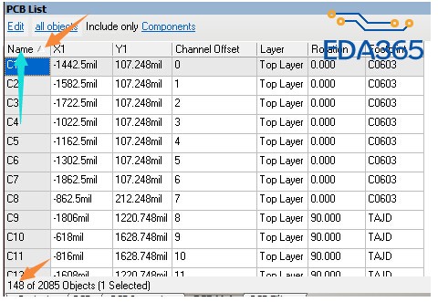 好了,现在我们就把PCB list调出来了,并且依照我们的需要列出了几项元器件信息: