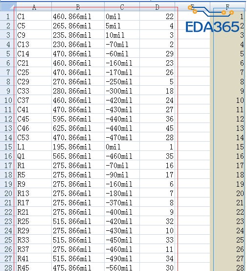 4.在PCB list中按照位号排序,然后将前四列都复制到EXCEL中: